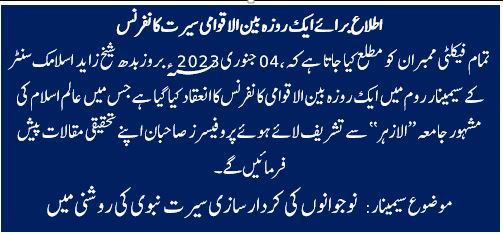 تمام فىکلٹى ممبران کو مطلع کىا جاتا ہے کہ ،04 جنورى 2023ء بروزبدھ شىخ زاىد اسلامک سنٹر کے سىمىنار روم مىں اىک روزہ بىن الاقوامى کانفرنس کا انعقاد کىا گىا ہے جس مىں عالم اسلام کى مشہور جامعہ ’’الازہر‘‘ سے تشرىف لائے ہوئے پروفىسرز صاحبان اپنے تحقىقى مقالات پىش فرمائىں گے۔